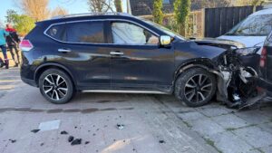 Door de klap raakten een voertuig van de weg en kwam ze tot stilstand tegen twee geparkeerde auto’s die in een tuin stonden. Hulpdiensten kwamen snel ter plaatse om de situatie veilig te stellen.