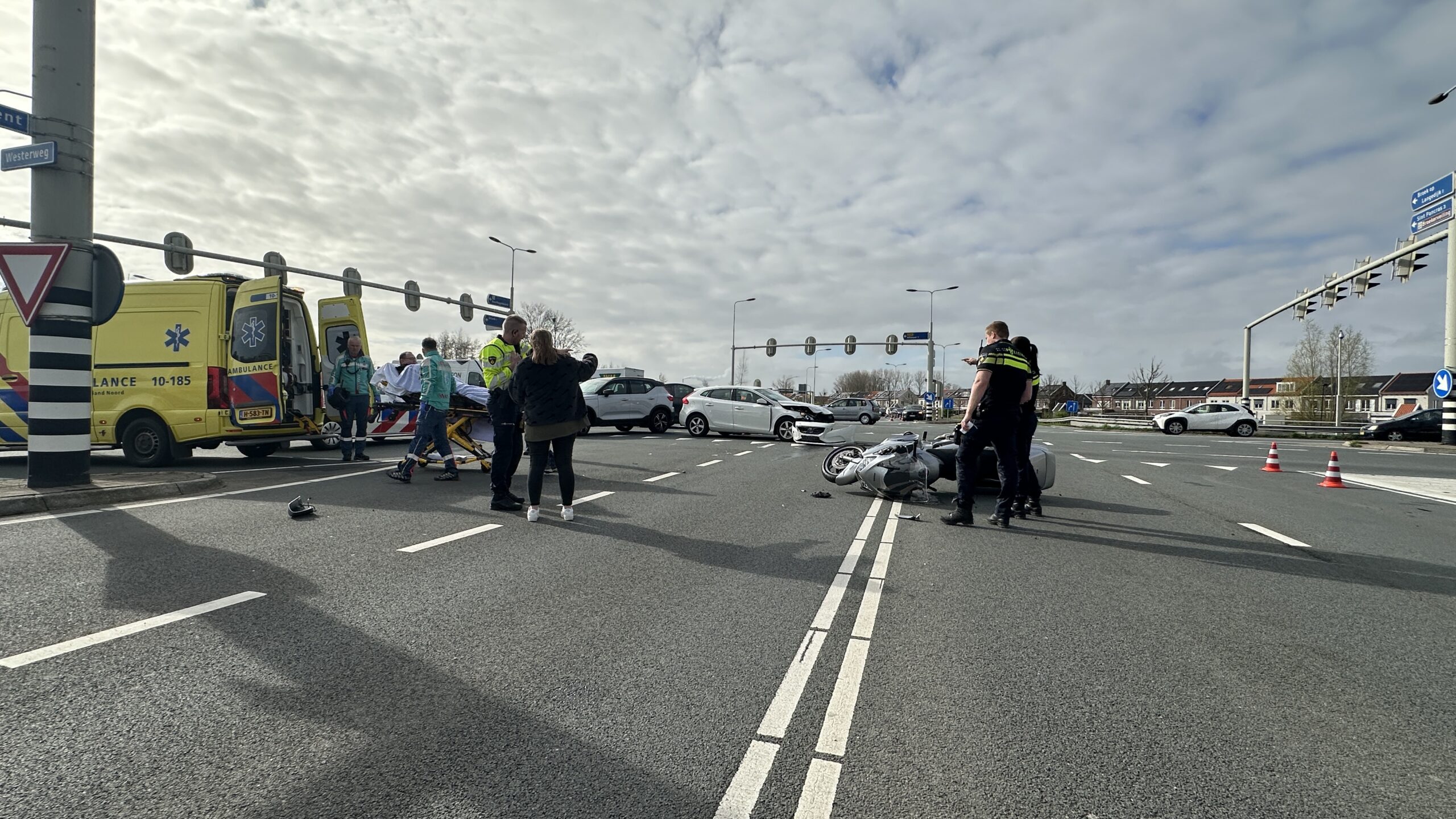 Een automobilist reed op het kruispunt terwijl de motorrijder afsloeg richting de Zuidtangent en is hierbij aangereden door een tegemoet komende auto. Hierbij is alleen de motorrijder gewond geraakt en zal door het ambulancepersoneel worden worden nagekeken. Volgens getuigen was de man alert en kon zelf op de brancard stappen. De kruising is tijdelijk afgezet waardoor er lange rijen met auto’s niet verder kunnen.