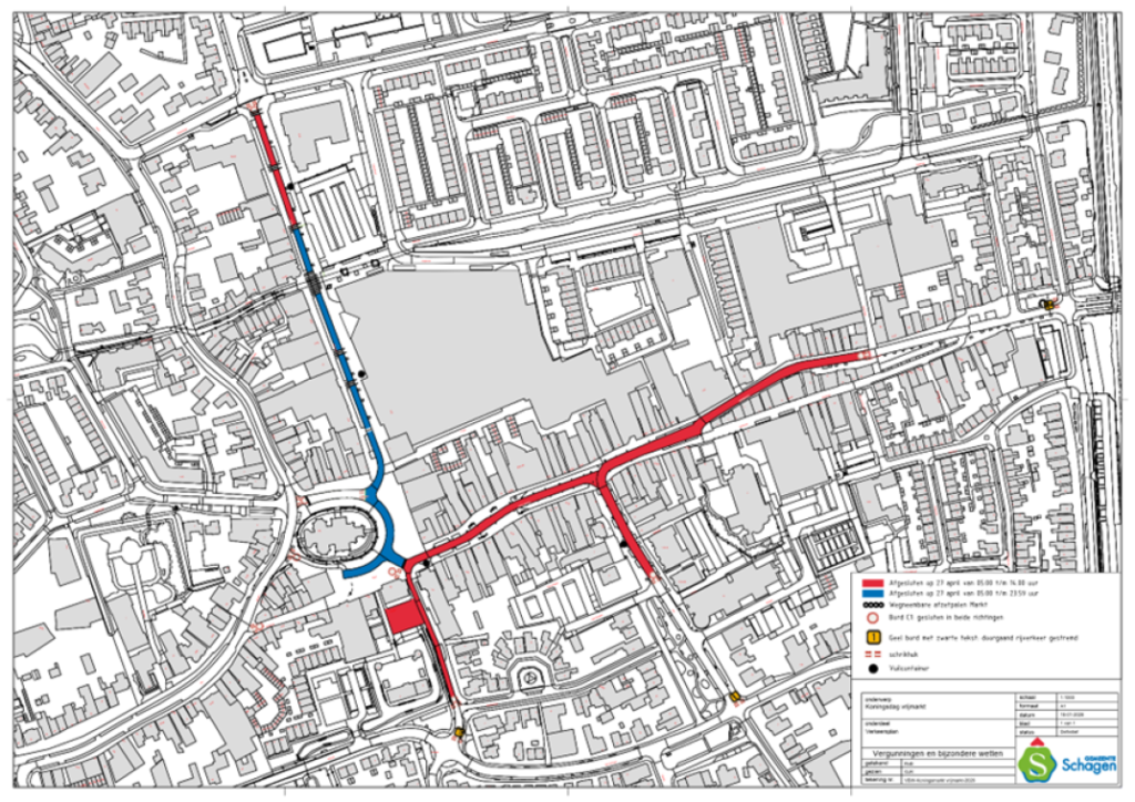 Tijdens Koningsdag en de daaropvolgende ochtend zijn verschillende wegen (gedeeltelijk) afgesloten voor verkeer (zie onderstaande plattegrond). Tussen 5.00 en 24.00 uur zijn de Markt en Nieuwstraat (gedeeltelijk) afgesloten voor het verkeer. De Torenstraat, Gedempte Gracht en Laan zijn van 5.00 tot 14.00 uur (gedeeltelijk) afgesloten voor verkeer. Bewoners hiervan wordt geadviseerd om de auto al de avond ervoor ergens anders te parkeren.
