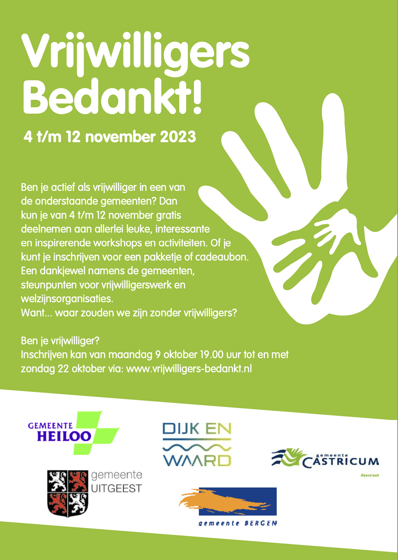 Het inschrijven voor Vrijwilligers Bedankt Dijk en Waard kan van 9 oktober t/m 22 oktober via de website: www.vrijwilligers-bedankt.nl